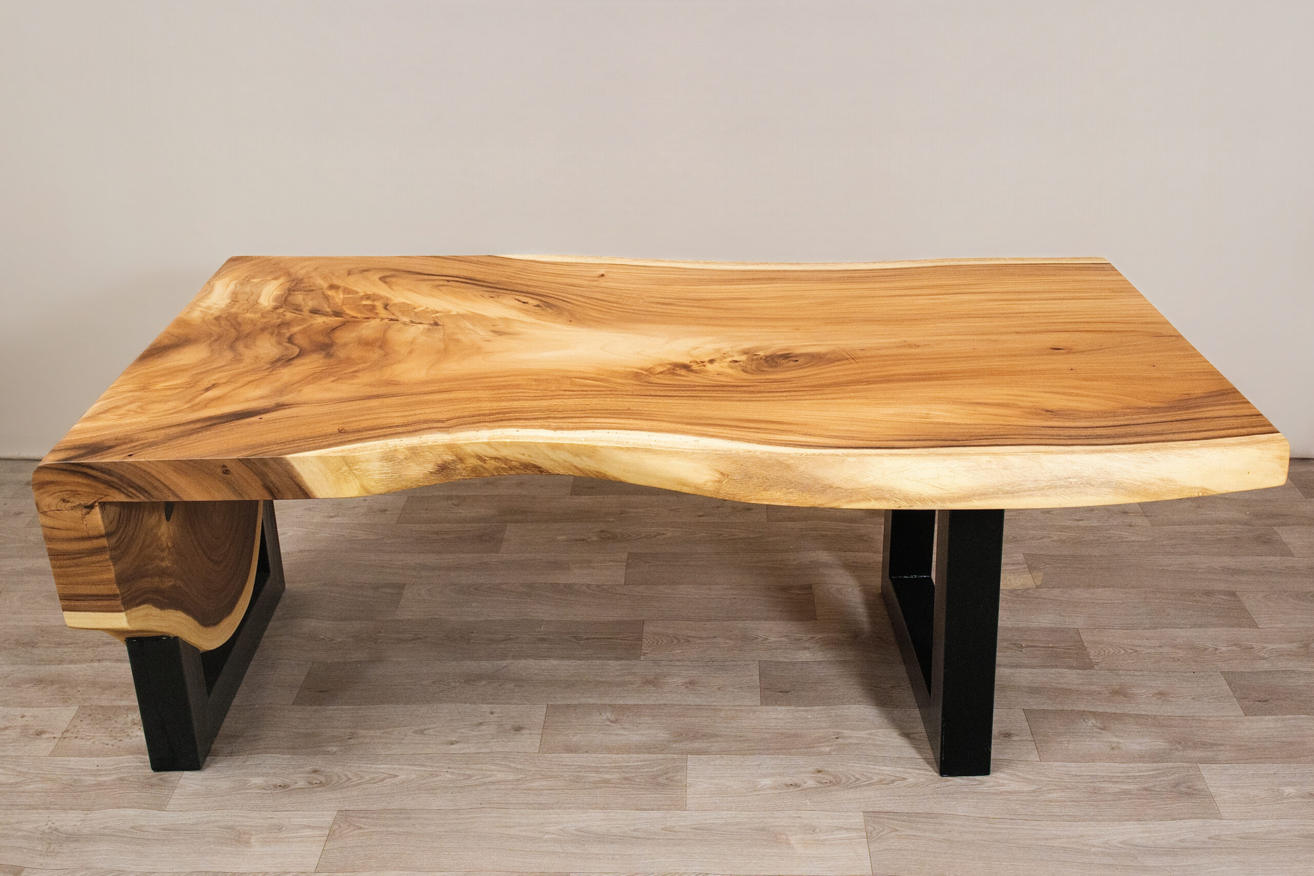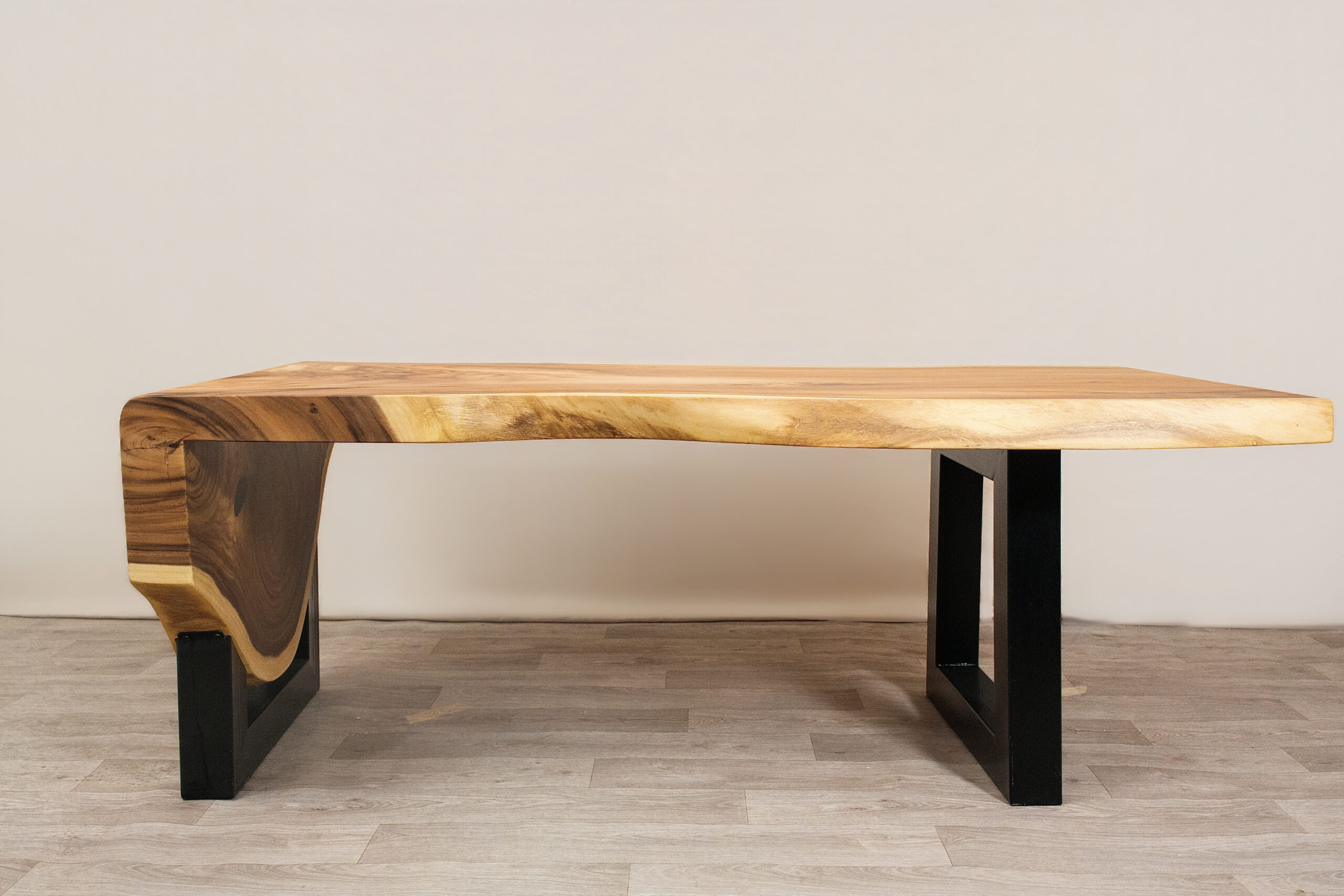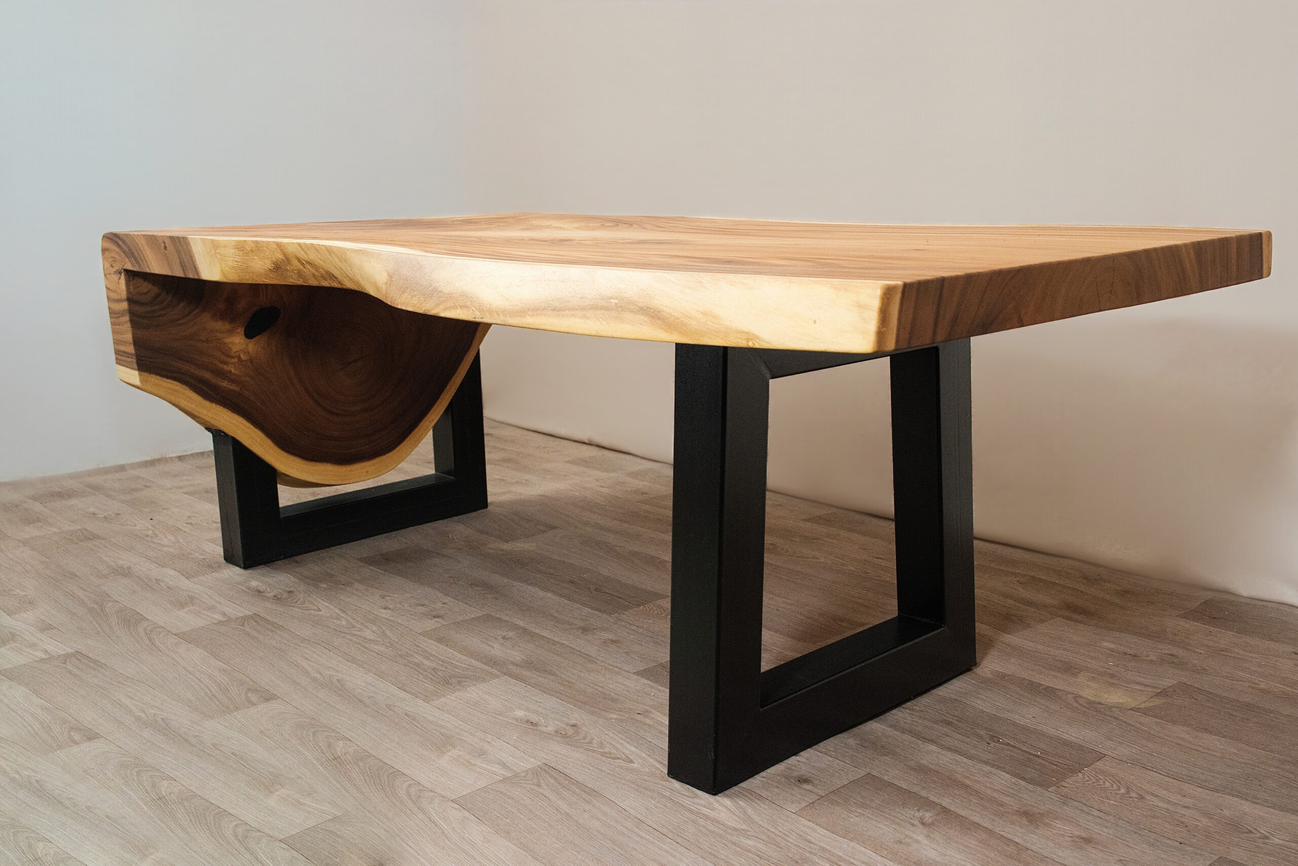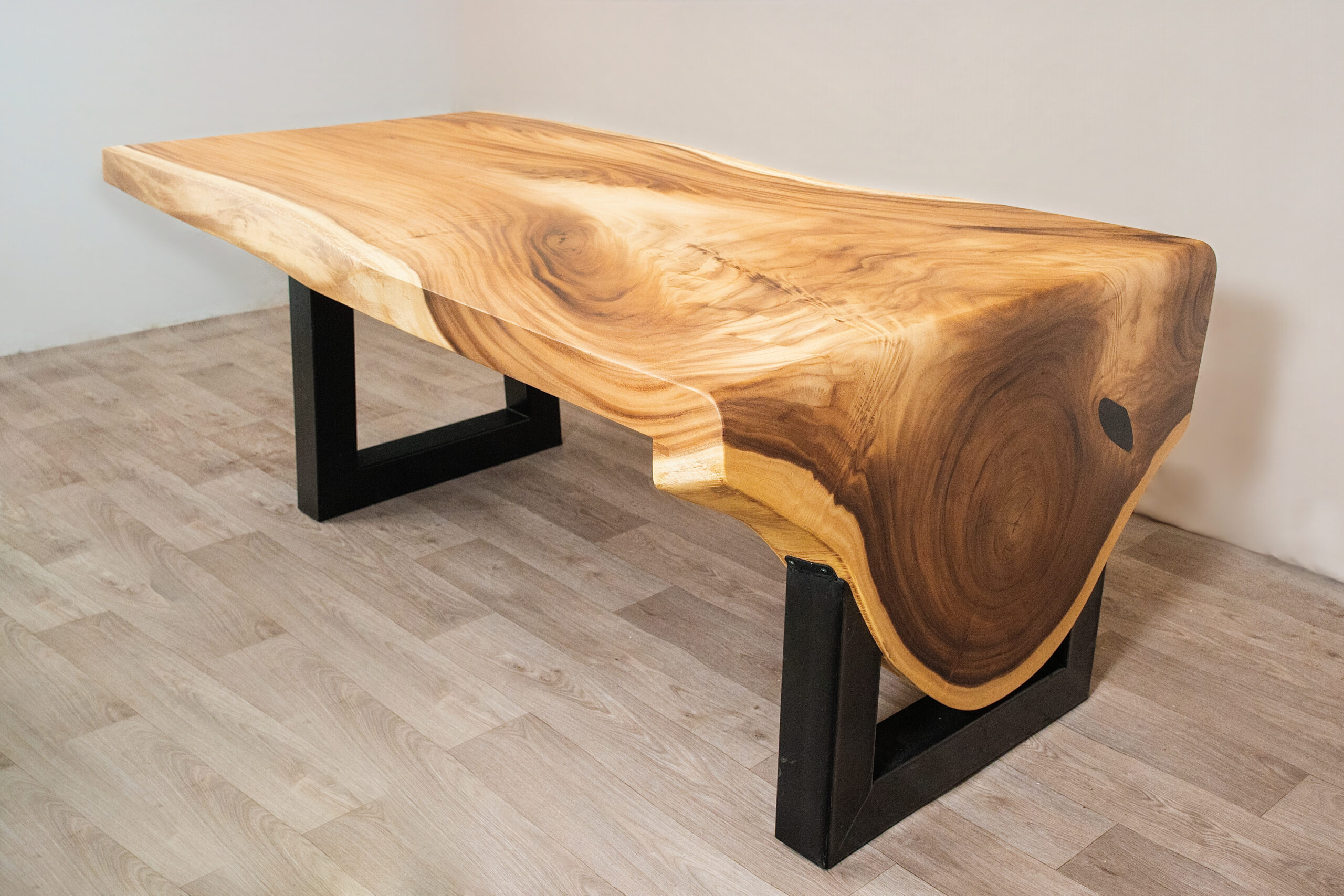 Mesa de comedor tipo cascada elaborada en madera natural, con vetas protagonistas, formas orgánicas y base metálica negra. Una pieza imponente que combina calidez, diseño y carácter contemporáneo para espacios con personalidad.